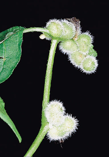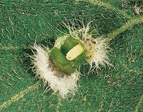 毛球狀蟲癭 癭體綠色,發生於葉部,直徑約6mm,表面被白色密毛。蟲室位於中央, 有一隻雙翅目癭蚋科(Diptera:Cecidomyiidae)幼蟲。 紡綞狀蟲癭 發生於莖部。癭體光滑,呈綠色,長約21mm,寬約8mm。蟲室縱向,造癭者待鑑定。