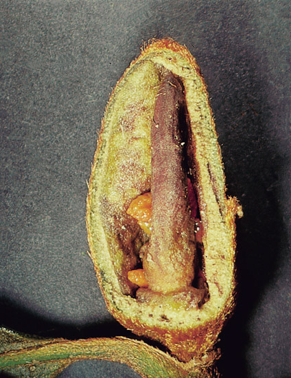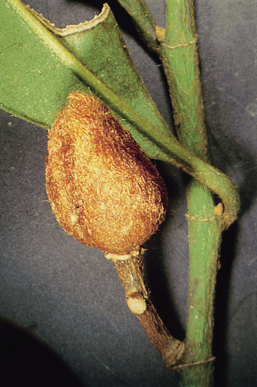 型圓錐狀蟲癭發生於腋芽, 由芽體膨大成癭體,長約