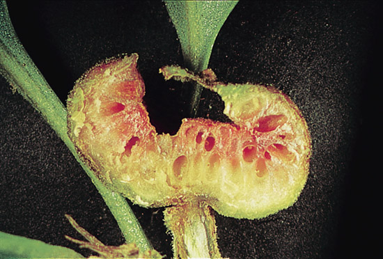 , 淺綠色或部分粉紅色。屬多室蟲癭,每室有一隻膜翅目(
