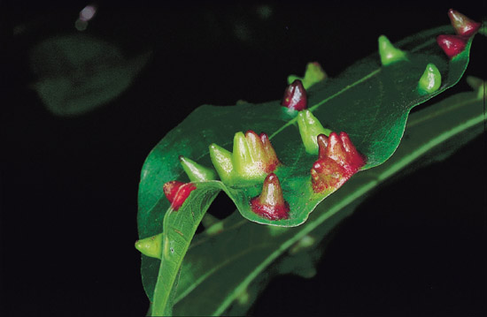 分布全島山麓陰濕溪谷,葉面常見山峰狀蟲癭,單生或聚生。癭體光滑, 呈綠色或鮮紅色,長約