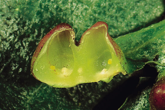 。癭壁薄,內含一隻若蟲, 造癭者為同翅目木蝨科(