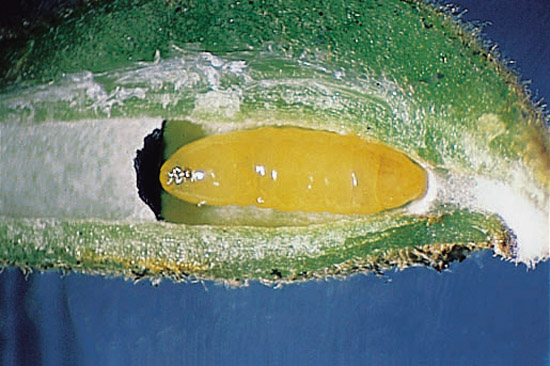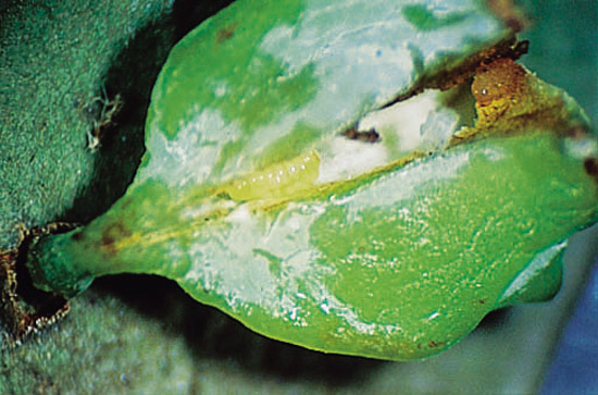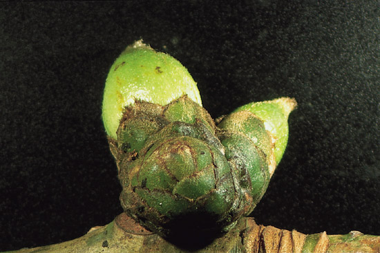 發生於頂芽或側芽,為單生蟲癭。癭體綠色,初期被有稀疏的短毛,基部具有芽鱗。 癭體長約12mm,寬約6mm。蟲室內含有單隻白色癭蚋幼蟲(Diptera:Cecidomyiidae)。