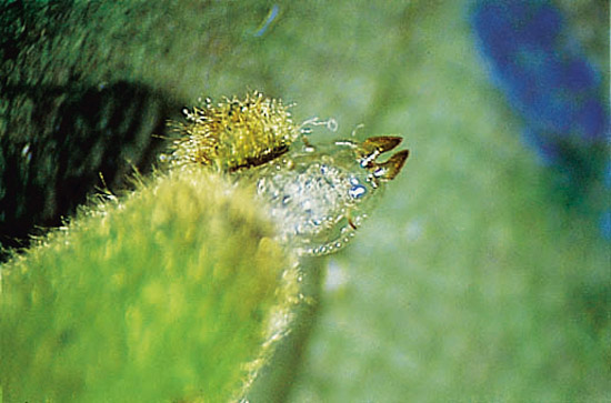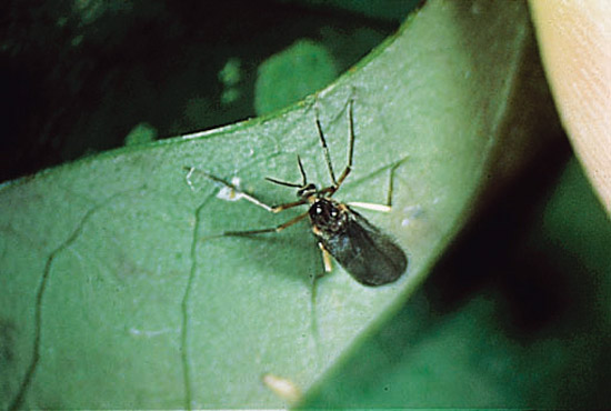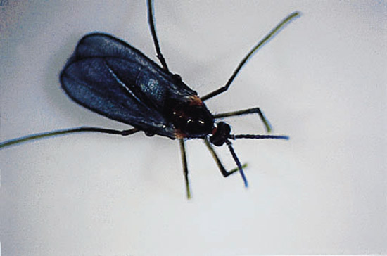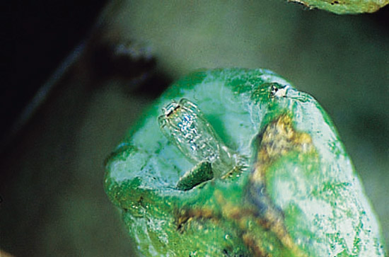 圓錐狀蟲癭常發生於幼嫩枝條之頂芽基部,多為十數個聚生。癭體長約 6mm, 寬約3mm,由綠色轉成深褐色,具有膨大褐色基座。 單隻黃色癭蚋幼蟲(Diptera:Cecidomyiidae )初期位於基部, 隨著發育,逐漸移動至縱向蟲室,最後頂端小尖突脫落,形成羽化孔釋出成蟲。