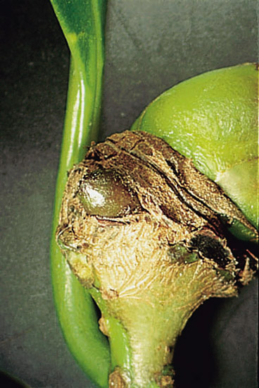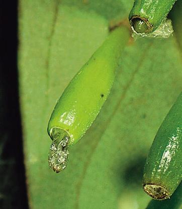常見於新生葉片之上表面。球狀癭體黃褐色,直徑約 9mm。癭壁薄,蟲室中空, 具單隻造癭木蝨,屬於同翅目木蝨科(Homoptera:Psyllidae)。 常可發現膜翅目的寄生昆蟲。成熟時癭體不規則開裂釋出成蟲。