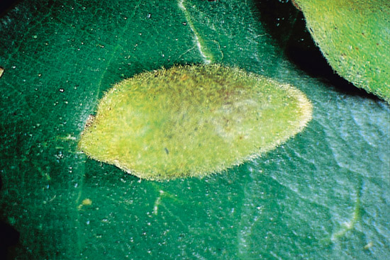 發生於葉上表面及下表面,多為單生蟲癭。癭體綠色至褐色,表面被白細毛, 長約10mm,寬約5mm,多平行葉面生長。蟲室內有單隻黃色造癭幼蟲,化蛹前移至基部, 並於蟲體前端形成隔離薄膜,於2月羽化,羽化孔位於癭體前端。 造癭者屬於雙翅目癭蚋科(Diptera:Cecidomyiidae)。