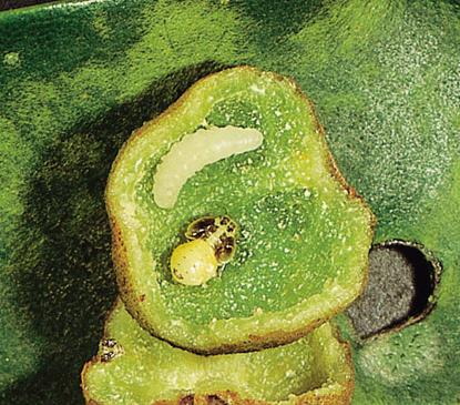 發生於葉背,單生或2∼3個聚生,極易脫落。癭體綠色,長約6mm,寬約4mm,光滑或具不明顯的縱稜。 蟲室內有單隻黃色的雙翅目癭蚋科(Diptera:Cecidomyiidae)幼蟲, 初期位於基部「之字形」蟲室,頂端具一小尖突。