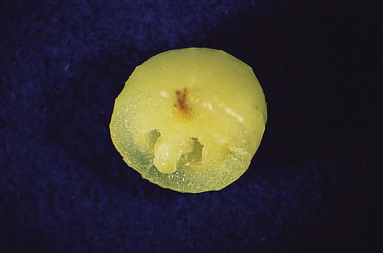 發生於葉背。癭體黃白色,直徑約3mm,中央具一凹點,極易脫落。蟲室位於中央, 內有一隻雙翅目癭蚋科(Diptera:Cecidomyiidae)幼蟲。
