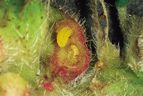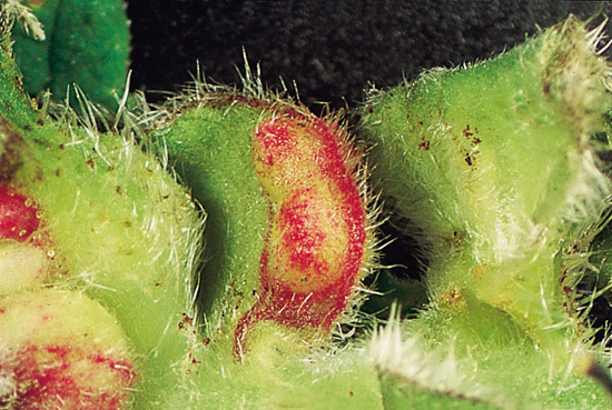 。有時為數個蟲室連生,外形如豆莢般。 造癭者屬於雙翅目癭蚋科(