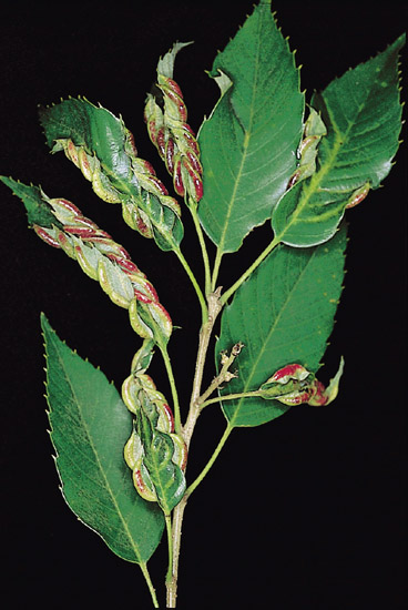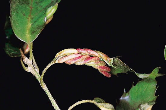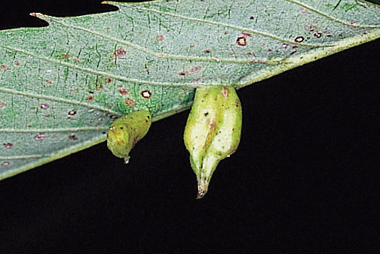 發生於葉背之中肋或側脈,有時幼葉所有側脈皆產生長條狀蟲癭,向葉面反捲,