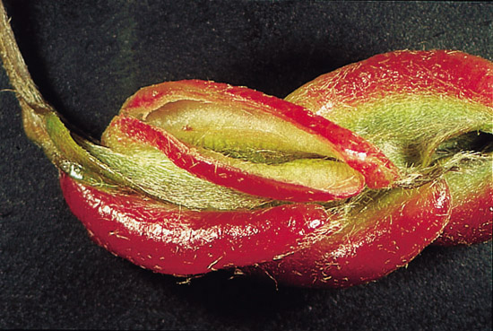 形成麻花辮般的外觀。癭體綠色或紅色,長約11mm,寬約 2mm。癭壁薄,