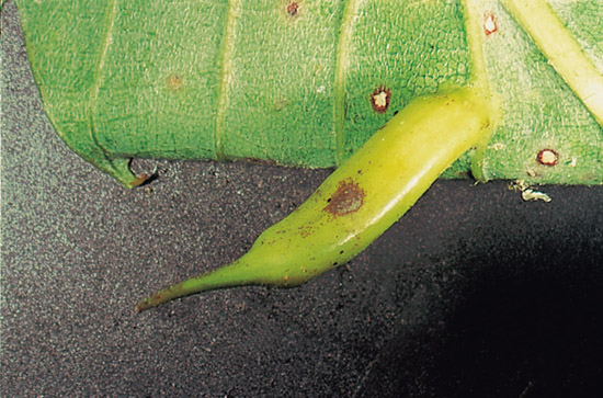 發生於葉背之葉脈。癭體綠色,長約9mm,寬約4mm,先端尖突。蟲室縱向,