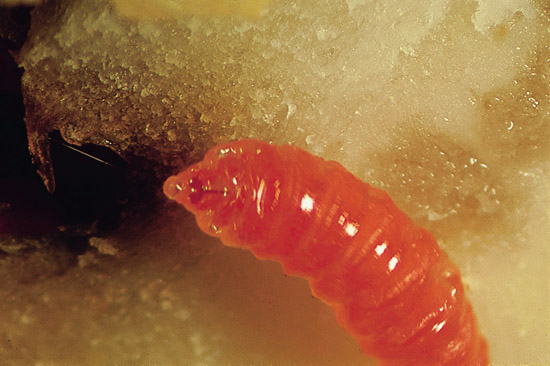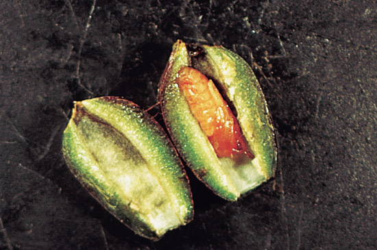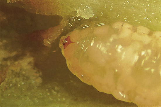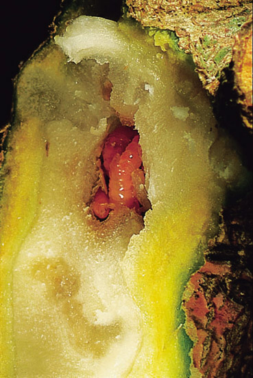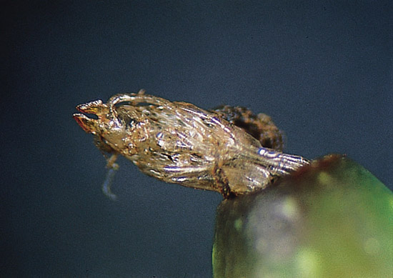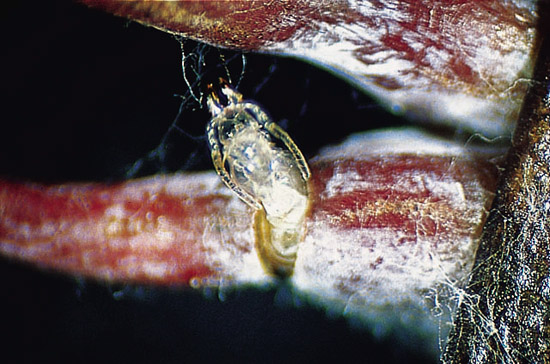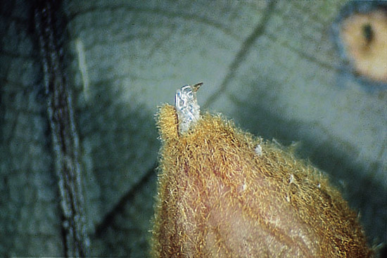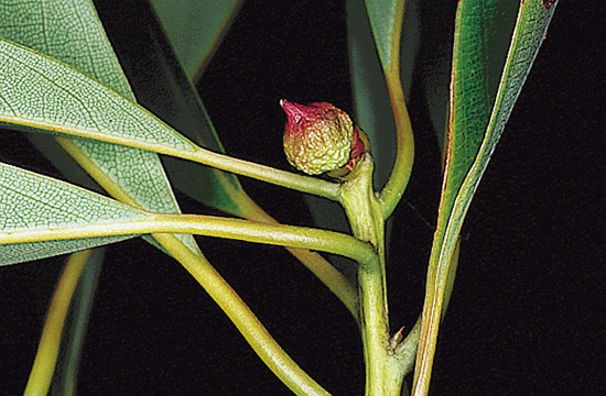 發生於頂芽或側芽,為單生蟲癭。癭體長約10mm,寬約4mm,呈綠色, 但上方略帶紅色,狀似小桃子,初期由芽鱗所包被。 蟲室內有單隻白色癭蚋幼蟲(Diptera:Cecidomyiidae)。