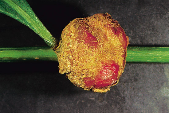 發生於一年生枝條,為聚生蟲癭。癭體深褐色,長約 7mm,寬約 3mm。初期呈紅色, 成長期才逐漸露出褐色膨大基座。蟲室內部有單隻黃色造癭幼蟲(Diptera:Cecidomyiidae), 約於早春化蛹,由頂端羽化孔釋出。