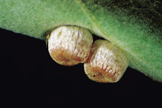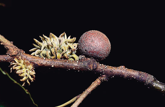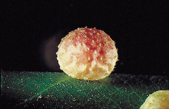 球狀蟲癭發生於葉部,黃色或略帶粉紅色,直徑約7mm,表面有疏而短的小突刺。