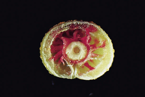 癭組織為暗紅色,蟲室位於中央基部,含一隻膜翅目(Hymenoptera)幼蟲。
