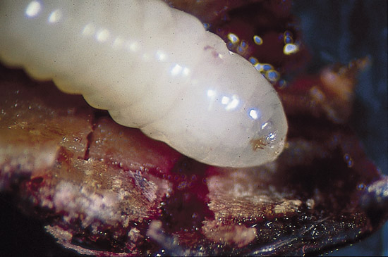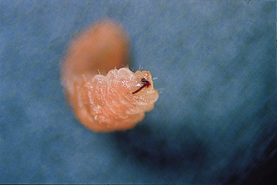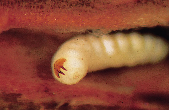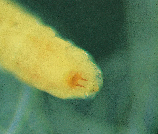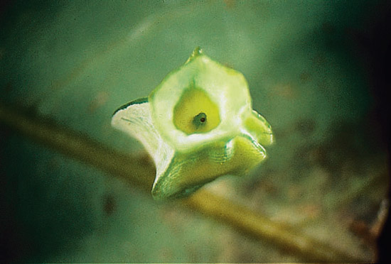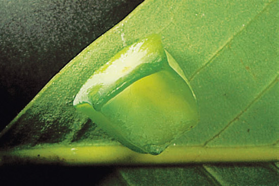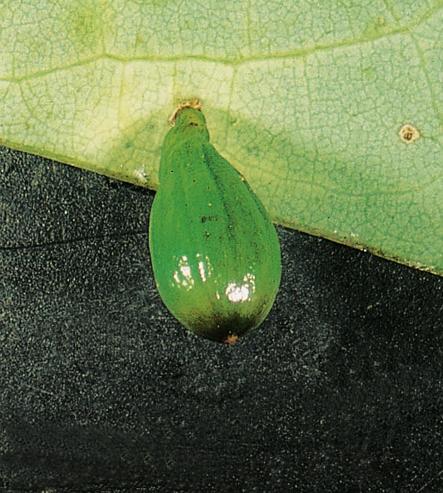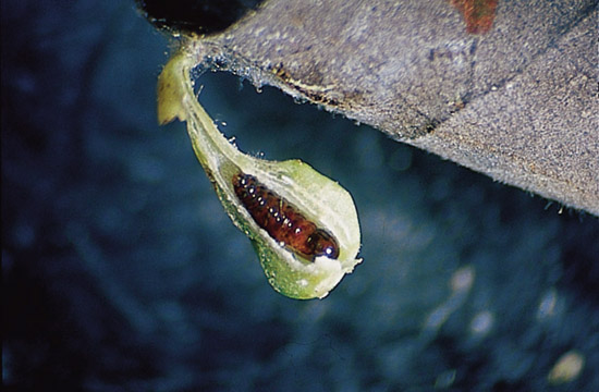 頂端中央下凹猶如一火山口。蟲室縱向,有單隻黃色幼蟲,