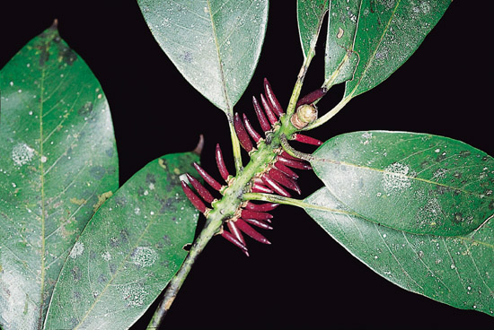 針狀蟲癭發生於幼嫩枝條,常密集聚生或整齊排列。癭體光滑,紅色,長約14mm, 寬約3mm ,基部具褐色膨大基座。 單隻白色癭蚋幼蟲(Diptera:Cecidomyiidae)位於縱向蟲室。 頂端的尖突在羽化期脫落露出羽化孔。