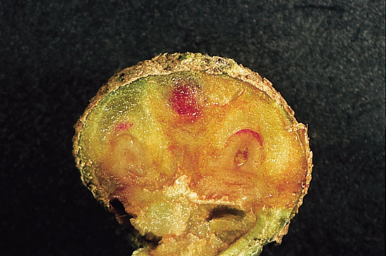 發生於枝條或節上,由莖直接膨大成褐色癭體,單生或數個連生。癭體長約20mm, 寬約13mm。隧道狀蟲室內有數隻粉紅色癭蚋幼蟲(Diptera:Cecidomyiidae)。