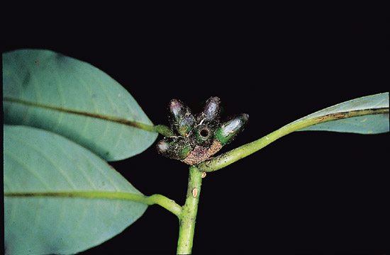 圓錐狀蟲癭聚生於一年生枝條。初期先形成褐色膨大基座, 成長期癭體才逐漸外露。成熟期癭體光滑呈深褐色,長約8mm,寬約4mm。 蟲室有單隻黃色幼蟲,羽化期由頂端羽化孔釋出。 由雙翅目癭蚋科(Diptera:Cecidomyiidae)昆蟲造成。