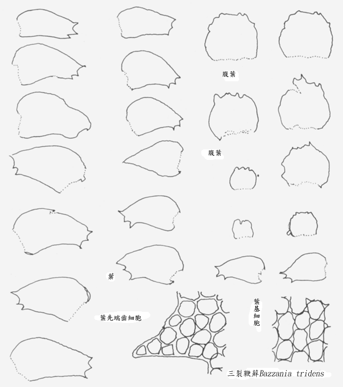 植物體灰綠色,於地上,岩石,樹幹基部密生成草席狀群體。莖5cm長,二叉分枝,鞭枝長而多。葉疊生,卵形或舌形,先端平截,具有3個大齒。葉細胞壁厚,三角隅小。腹葉連生,倒伏於莖上,圓方形,全緣或鈍波狀,除基部外其他細胞透明。臺北烏來乾溝,陽明山,苗栗,臺中八仙山,中雪山,南投溪頭,梅峰,嘉義上玉山沿線,高雄南橫143K,屏東南仁山,宜蘭蘭臺山,大平山,天送卑,花蓮朝日山,臺東蘭嶼;東亞型。