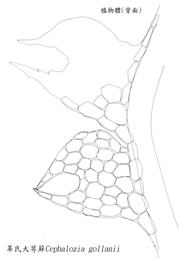 植物體雌雄異株。中型,透明或淡綠色,12mm長,1.1mm寬,密葉,壓伏聚生於土上。莖彎曲,橫切呈平─凸形,表皮細胞10列(背面3列,側面2列,腹面5小列),常單一,下部呈走莖狀,莖葉疏生,平面,二列,背面觀時長下延,寬卵形,極不對稱,長及寬0.55mm,1/3或1/2深裂為2裂片,裂片夾角半月形,二裂片等大,漸尖,向外伸出或略內彎。葉細胞大,薄壁,50∼67μm,三角隅無,角質層平滑。莖上腹葉無。雄器位在莖或枝之中間,短穗狀,雄苞葉4∼5對,每一苞葉只有一藏精器,苞葉二裂片或三裂片對貼,裂片三角形,尖銳。新竹鴛鴦湖,嘉義玉山,兒玉山,塔塔加,高雄;東亞型。 |