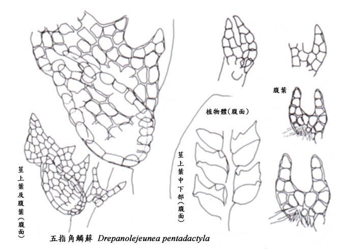 五指角鱗蘚Drepanolejeunea pentadactyla(細鱗蘚科Lejeuneaceae)