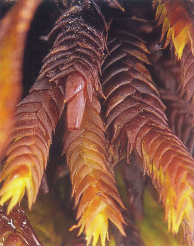 植物體著生於枝上。黃綠色∼紅紫色。莖1∼2cm長,束狀分枝。假根密生於莖基部之腹面。葉重疊緊密,2裂,裂深1/2,背片狹卵形,尖銳,兩側緣強烈的內捲,基部耳狀或袋狀。腹片比背片略大,卵形,強烈凹陷,腹緣內捲,基部略耳狀,突出,超出莖,背緣內捲,葉先尖,具備2個小齒。新竹鴛鴦湖;東亞型。