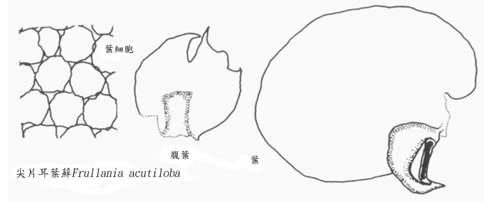 | 長0.62mm,寬0.56mm,基部無下延,先端兩裂片,裂口大,邊緣偶有鋸齒,與莖連接處呈弧形;腹片兜形,長0.36mm,寬0.6mm,先端尖銳。南投溪頭,塔塔加鞍部-沙里仙溪,梅峰,嘉義上東埔,排雲;熱帶亞洲型。 |