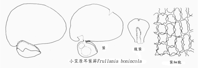 植物大型,橄欖色至棕色;莖不規則羽狀分枝,莖含葉寬1.4mm,莖寬0.16mm;背片長橢圓形,1.06×0.76mm,先端圓鈍,背緣基部略呈圓鈍狀下延,中央細胞圓形,22×13μm;腹葉倒卵形,0.44×0.38mm,基部不會下延,先端兩裂片,裂口小;腹片兜形,0.3×0.34mm。嘉義上東埔塔塔加鞍部-玉山前峰,阿里山,臺東向陽小徑,知本:東亞型。 |