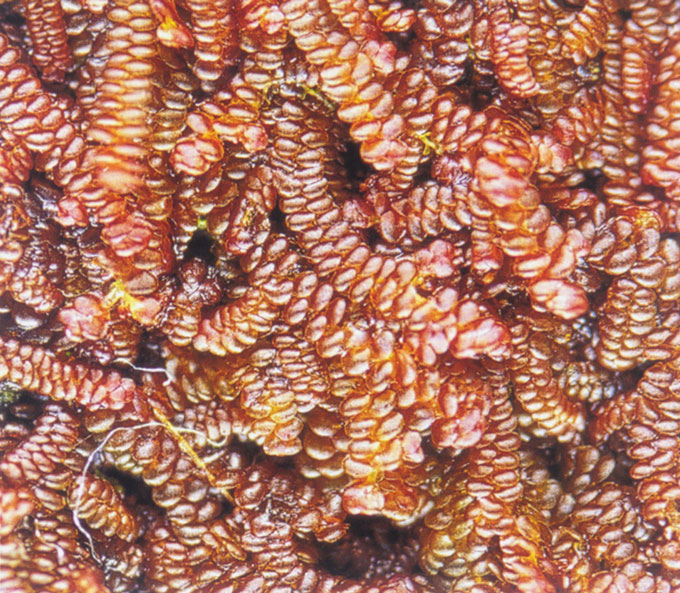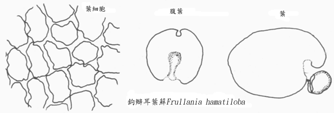 植物大型,紅棕或黃棕色,扁平;莖不規則羽狀至二回羽狀短分枝,背片圓形,0.76×0.52mm,背緣基部呈耳狀或半圓形下延,腹緣基部不會下延,中央細胞接近圓形20×38μm,壁孔與三角隅明顯;腹葉圓形,0.42×0.44mm,先端兩裂片,偶有1∼2微鋸齒,與莖連接處呈弧形或淺弧形,基部略具漸尖下延:腹片兜形,0.18×0.18mm。南投縣下東埔,塔塔加鞍部-沙里仙溪,高雄關山埡口;東亞型。