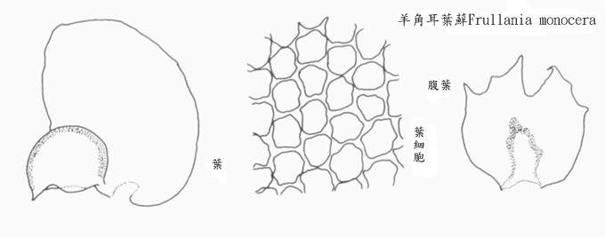 橢圓形,1×0.68mm,先端圓鈍,背緣基部半圓形下延。腹緣基部不會下延。中央細胞圓形,15×17μm;腹葉圓形,0.66×0.62mm,先端兩裂片,裂角大,葉緣具2∼6粗鋸齒,與莖連接處呈淺弧形,基部不會下延;腹片兜形,0.32×0.4mm。臺北烏來,南投下東埔,塔塔加鞍部-沙里仙溪,溪頭,嘉義阿里山,玉山;熱帶亞洲及大洋洲型。
