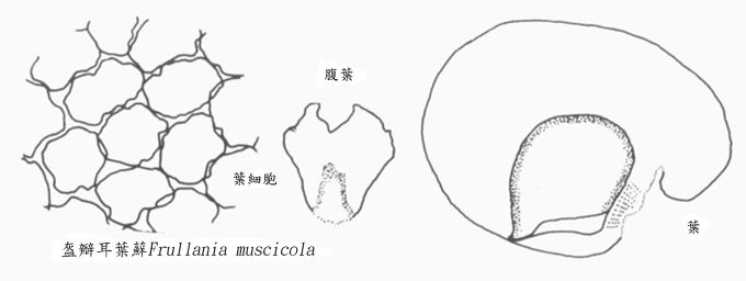 植物大型,棕綠色至黑棕色:莖規則二回羽狀分枝,莖含葉寬1.06mm,莖寬0.06mm;背片呈圓形、卵圓形或長橢圓形,0.94×0.66mm,背緣基部明顯耳狀下延並逾越至莖的對邊,腹緣基部不會下延,中央細胞長形12×18μm,壁孔明顯;腹葉圓形,0.68×0.6mm,先端兩裂片,裂口小,先端近癒合.縱向皺摺明顯,與莖連接處接近水平,基部明顯耳狀下延;腹片兜形0.34×0.34mm。桃園拉拉山,苗栗大霸,臺中雪山,嘉義玉山,阿里山,高雄天池,檜谷-關山,南橫143k登山口,宜蘭太平山,大元山,南湖大山,花蓮慈恩,臺東知本山,向陽山,大武山;東亞型。 |