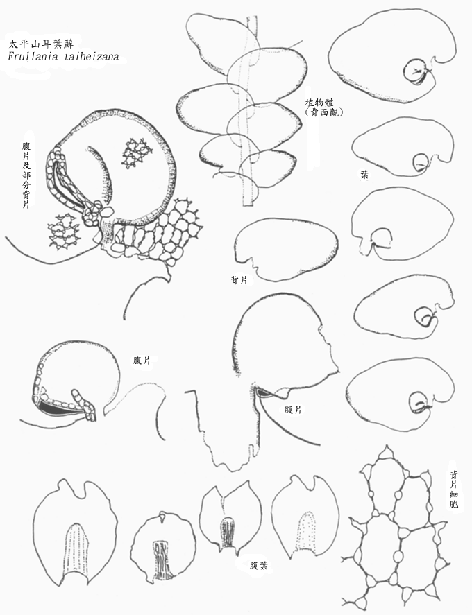 植物體中型,.棕綠色;莖不規則羽狀分枝,莖含葉寬1.8mm,莖寬0.16mm;背片長橢圓形或卵形,1.36×1.06mm,先端圓鈍,背綠基部耳狀下延,腹緣基部下延,中央細胞圓形,29×24μm壁薄;腹葉橢圓形,先端兩裂片,與莖連接部分呈拱形;腹片兜形,0.28×0.28mm,臺中七卡山莊,宜蘭太平山;臺灣特有型。