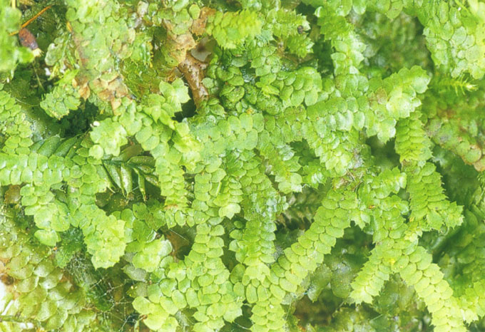 植物大型,黑綠色或橄欖綠或棕色,成片狀;莖不規則羽狀至二回羽狀分枝,莖含葉寬0.9mm,莖寬0.08mm;背片長橢圓形,1.06×0.78mm,先端漸尖形,葉緣具1∼4鋸齒,背緣及腹緣基部均不會下延,中央細胞圓形,23×18μm,壁薄;腹葉0.54×0.46mm,先端兩裂片,葉緣無鋸齒,或具有1∼2粗鋸齒,基部明顯漸尖下延;腹片圓筒形.0.22×0.18mm。臺北孝義村,新竹鴛鴦湖,臺中和平鄉,南投沙里仙溪林道至雲杉林,溪頭,東埔溫泉至彩虹瀑布,嘉義玉山,宜蘭太平山工作站,南湖大山,花蓮天草山,臺東知本山,蘭嶼;舊世界溫帶型。