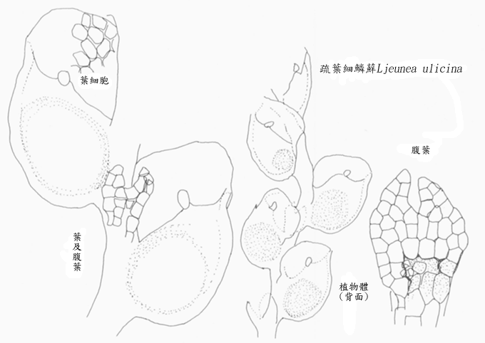 植物散生於濕性常綠樹林林床岩上或腐木上,斜上,白綠色至黃綠色,長3∼5cm,莖直徑0.35mm,含葉寬1.5mm,規則羽狀分枝,羽枝近直立開展,8∼15mm長,先端漸細,有小葉,具假根,因此呈鞭枝狀。莖葉強凹,1.25mm長,基部0.65mm寬,先端有二裂片,1/2∼3/5深裂,夾角鈍形,裂片多少外展,裂片各自再深裂,次裂片狹,基部5∼6細胞寬,上部突長漸尖成剛毛狀,背緣略擴大,具有6枚纖毛,腹緣多少彎缺、或亞縮,無纖毛。次裂片之細胞21∼24μm直徑,剛毛部細胞甚長,100∼120μm長,10∼15μm寬,三角隅大,結瘤狀,因此邊緣結瘤明顯,基部細胞45∼55×25μm,厚壁,三角隅結瘤狀,少匯流;角質層細微疣。莖之腹葉壓伏,0.9mm長,中間0.5∼0.55mm寬,基部0.35∼0.4mm寬,達2/3深裂,裂片略外展,裂片各自再分,次裂片如同側葉次裂片。生殖器官不明,無性芽缺如。新竹鴛鴦湖,宜蘭太平山,臺東浸水營─屏東四重教會;東亞型。 |