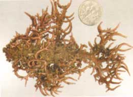 藻體直立,高度約10cm高,色澤呈粉紅色。本種具密集且較為粗大的枝條,呈圓錐狀分枝,其頂端無鈣化,末端枝條圓鈍。枝條高度鈣化,乾燥時則易脆,呈灰白色。經去鈣後的髓細胞仍為緊黏的次單位,細胞直徑15∼20μm。具假根,於皮質細胞下部的部位形成,直徑約6∼8μm。見於潮間帶以及亞潮帶上部。 |