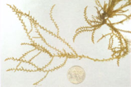 藻體直立,叢生,附岩性,顏色多變,呈紫紅色、棕色、紅褐色或黃綠色。高度可達25cm,枝軸直徑約0.75∼1.5mm。基部具一盤形固著器附著於基質上,其上具有一至數個主軸。分枝鬆散且為互生分枝;其主軸上無刺,並生出呈螺旋狀排列的有限枝條,長度約2mm其上尚具有呈螺旋狀排列,外觀似刺的小枝,大小不超過5mm長。枝頂呈金字塔型,具向不明顯內彎的毛絲體。具皮質化,可見明顯的軸絲。較老的枝軸中,其軸絲旁具有小的不定藻絲。 |