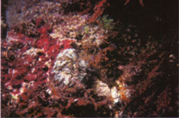 藻體匐臥,外觀呈團塊狀,由許多類似鹿角的葉密集重疊在一起。群生的團塊約6cm寬,在水下常呈現藍綠色螢光,質地軟骨質,稍具韌性,藉由底部的盤性固著器附著於基質上。本種常緊附於基質上,不易採集到完整的個體。枝軸大多數為扁平狀,其分枝呈叉狀或稍微不規則,分枝回數很少,約二回分枝,枝條短,其側邊發出像瘤狀且短的小枝,小枝則略呈圓柱形或半圓柱形。小枝條的頂端部位縱切,可見到皮質細胞具有明顯的突起,皮質細胞間並無次級紋孔連結,活體的皮質細胞亦無見到無櫻桃體;本種分布於潮間帶中下部以及淺水域的潮下帶。 |