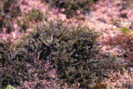 藻體直立,質地呈軟骨質,高度可達25cm,為臺灣東北部冬季明顯易見的大型種類,色澤呈墨綠色、深綠或褐綠色。基部具一明顯的盤狀固著器附著於基質上,附岩性。枝條及枝軸皆呈圓柱狀,最顯著之特徵為枝軸以及側枝呈三向分枝,以頂端最明顯易見,然而在生殖時期以及生殖後期則因末端枝的繁生而特徵不顯著。標本經過染色後,於枝條頂端縱切,可見皮質細胞突起,且枝條表面之皮質細胞間可見次級紋孔連結,橫切面則見髓細胞具鏡狀增厚。活體時的皮質細胞可觀察到1個櫻桃體,毛絲體內亦具有一個櫻桃體。營養體的軸細胞產生4個圍軸細胞。數量以11-3月為豐,見於北部。 |
