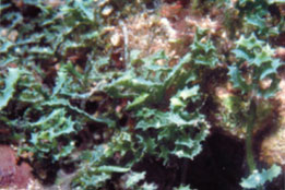 藻體攀生,具有匍匐枝及直立枝部份,色澤呈翠綠色或深綠色。直立枝為長形呈雙鋸齒的葉,葉通常稍呈螺旋狀或稍微不規則生出,而非豎立;其鋸齒於葉之平面或稍微於葉之其他方向產生。底部的匍匐校系呈圓柱狀,下方具有白色的纖維鬚狀假根,且緊密附著於基質上。枝條間的內部並無細胞壁分隔,然而具有似指狀的分隔帶呈些微的區分。附岩性。多核。 |