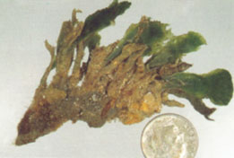 藻體直立,呈綠色至深綠色,具一短柄及上部呈絨塊狀的葉,葉體扁平,呈一平面。藻體呈扇形或稍呈裂葉狀,高約5cm。產量少。不易發現。 |