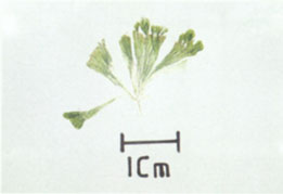 藻體直立,體型小,色澤呈淺綠色,外觀呈扇形薄膜狀,質地略呈粗粒感,不光滑 鈣化,約1cm∼2.5cm高,生長於潮間帶中部或較隱蔽之石塊間。枝條部分枝,其基部呈楔形。皮質囊胞直立,直徑約40∼50×m。 |