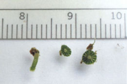 藻體直立且細微,高度少於0.5mm,其基部發出一個淺黃色或白色的柄支持上端的綠色傘狀體,此乃由10∼15個配子囊輻射枝於彼此間的側邊相互連結而成,其邊緣呈圓弧形,單一配子囊不突出於邊緣。本種單一生長或群生,由於個體非常細微,且有時夾雜於其他藻體上或附著於岩石上但被沙粒覆蓋,故不容易見到。 |