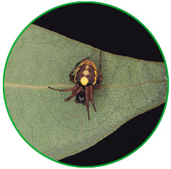 【形態特徵】 雌蛛體長5 ~ 8 mm。背甲黑褐色,有光澤。頭部隆起,頸溝明顯。胸板黑褐色。步足紅褐色至深褐色,脛節末端有黑色輪狀紋。腹部黑褐色,卵形,背面有三列黃白色縱斑。中列有三個斑,最前者為鮮明的大圓斑,之後有二個較小的菱形斑;側列之黃白斑前後相連成縱帶,並在中列之後左右列合併且延伸至尾端,其上還有二條細橫紋在尾端之前。腹面在絲疣前方有一對黃色圓斑。外雌器小,垂體呈半圓形。雄蛛小形,