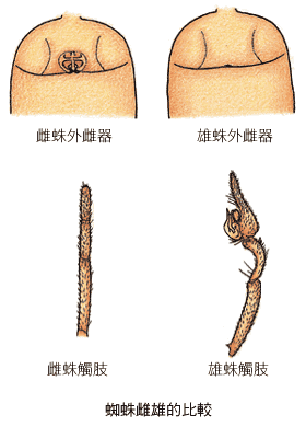 未見其他構造。雌蛛和很小的雄性幼蛛,其觸肢末端正常,不膨大,也無特殊構造;有些種類還具有爪。另外,成熟的雌蛛一般具有硬骨化且構造複雜的外雌器。雄蛛生殖孔外面一般無堅硬的骨化構造,即使有也只是簡單和平面的硬骨化皮膚。雄蛛的觸肢器和雌蛛的外雌器具有種別性,因此,也是鑑定蜘蛛種類很重要的依據。 在體型上,大部分的蜘蛛是雌蛛較雄蛛稍大;但是有些種類,如人面蜘蛛屬(Nephila)、棘蛛屬(Gasteracantha)、雲斑蛛屬(Cyrtophora)和金蛛屬(Argiope),雌蛛體長往往是雄蛛的數倍大。一般蜘蛛的上顎雌雄構造無明顯差異 |