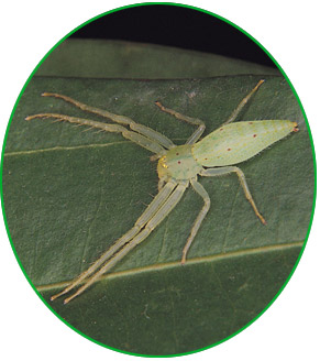 | 【形態特徵】 雌蛛體長約8~12 mm。全身淡綠色,非常美麗。背甲在中央和兩側各有一條綠色縱帶,中窩前側方有一對黑褐色斑點,眼睛外圍鑲白邊。中窩縱向,頸溝和放射溝明顯。第I、II步足特別強大,其脛節和蹠節下方具有強棘。腹部紡垂形,前端較寬,尤其在腹部前方2/5處最高最寬,向後逐漸變細。腹部背面通常具有4~5對黑褐色小斑點,但也有些個體較不明顯。雄蛛體長約8mm,頭胸部綠褐色,眼域及第I、II步足強大,腿節基部上方為深褐色,下方有許多強棘。中窩、頸溝和放射溝很明顯。腹部細長,前端稍寬,後方較細,其 |