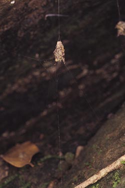 ![]() 吊鐘姬蛛的巢室呈鐘形, 其垂下地面的絲具黏球 |