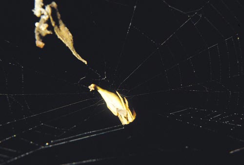 第二種方式是蜘蛛模擬周遭的環境或不可食用的事物,以欺騙天敵。這種方式最簡單的方法就是形成保護色(camouflage)。例如臺灣綠貓蛛(Peucetis formosensis)和嫩葉蛛(Oxytate striatipes)常在葉面上活動,身體呈綠色,不易被發現;三角蟹蛛(Thomisus labefactus)和日本花蛛(Misumenops japonicus)常躲藏在花朵上捕食昆蟲,體色是呈白或黃,一方面可以減少昆蟲的戒心,一方面可以避免被天敵發現; 茶色姬鬼蛛(Neoscona punctigera)往往能隨休息的背景改變體色;而落葉堆中的花蟹蛛(Xysticus sp.)呈黃褐色;樹幹上的長疣蛛(Hersilia sp.)像地衣(lichen)的斑紋,不易被天敵發現。若體型能夠改變,擬態周邊的景物,欺 |