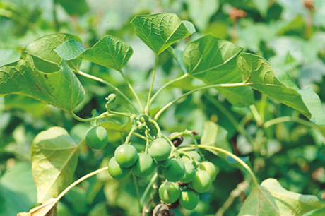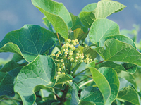 curcas L.俗名:水漆,木花生,臭油桐,Physic Nut,Barbados Nut. 形態特徵:小喬木或灌木,株高2∼3m,樹皮蒼白色,樹液水狀無色。葉叢生枝端,平滑,廣心形,全緣或3∼5裂,具長柄,長7∼18㎝,寬6∼16㎝托葉細小。花雌雄同株,聚繖花序腋生或頂生,作繖房狀排列;花冠黃綠色,雄花冠內有毛。蒴果橢圓形長2.5∼3㎝,黃熟開裂。 生態/分布:原產美洲熱帶,臺灣引進普遍栽植。 用途/解說:麻瘋樹的種子與巴豆一樣都是峻瀉劑,種子榨出出黃綠色油脂,可供肥皂製造及機油。 |